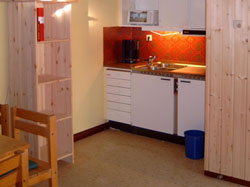 Die kleine Einbauküche ist mit einem 2-Platten-Herd, Kühlschrank, Wasserkocher und Kaffeemaschine ausgestattet. Geschirr, Besteck und Töpfe sind vorhanden.
